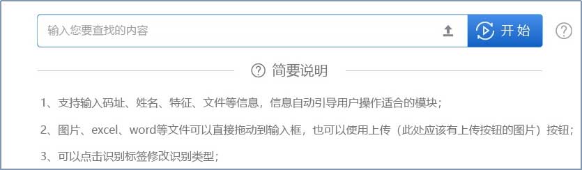 建設統(tǒng)一入口界面,實現(xiàn)用戶的多種輸入方式,包括但不限于各類碼址、名稱、地址、特征片段、數據文件、文檔文件等。支持通配符方式;支持中英文兩個語種的輸入支持和判斷,支持中英文混合輸入;支持多條信息或文件的輸入。